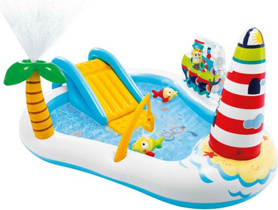 Dit geweldige Intex Speelbad Visplezier zal je kinderen urenlang plezier in de zon bezorgen. Het is veel meer dan een zwembad, het is een echt speelparadijs! Met een mooie glijbaan, een palmboom waar water uit spuit, een hengel en 2 opblaasbare vissen, 6 ballen om mee te spelen in de speelwand, en een grote opblaasbare vuurtoren, is er genoeg om de kleintjes te vermaken.