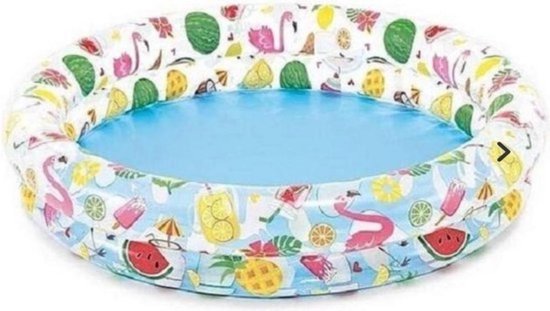 Dit leuke 2-ringsopblaasbad met flamingo, ananas en watermeloen motief is perfect voor je tuin, balkon of terras. Door het praktische formaat kan het ook als ballenbad gebruikt worden, wat je kinderen eindeloos waterplezier biedt tijdens die warme zomerdagen. Het geteste vinyl materiaal is geschikt voor kinderen vanaf 2 jaar en is sterk en duurzaam, terwijl de dubbele kleppen het oppompen gemakkelijk maken. Houd altijd toezicht op je kind als het het zwembad gebruikt.