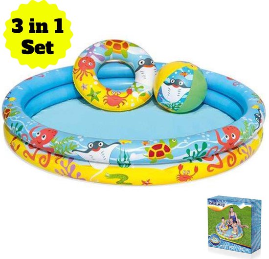 Zoek je een opblaasbaar zwembad dat perfect is voor je kleintjes? Zoek niet verder dan de Pool Set 3 in 1! Deze unieke set bevat een opblaasbaar zwembad, een bal, en een fiets, allemaal in een prachtig maritiem thema dat kinderen aanmoedigt om te zwemmen. Het zwembad zelf is gemaakt van zacht maar duurzaam vinyl en biedt gemakkelijk plaats aan twee kinderen.